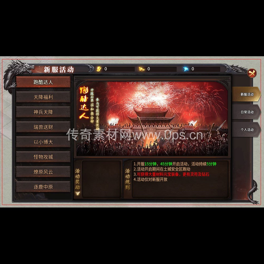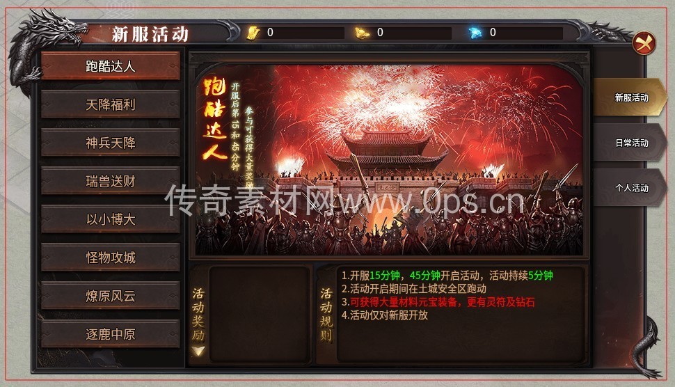 关键词:新服活动 跑酷达人 天降福利 神兵天降 瑞兽送财 以大博小 怪物攻城 燎原风云 逐鹿中原